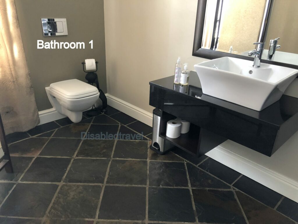 Jeffreys Bay, Eastern Cape • Access from the paved parking area to the guest house via a suitable ramp. • Spacious bedrooms with access to the cupboards. No lowered hang rail. • Three of the bedrooms has spacious bathrooms, all fitted with roll-in showers. • Bedroom 1 has an open plan bedroom and bathroom. • Bedroom 2 has sliding door access to the bathroom. • Each roll-in shower is fitted with lever tap, handheld shower as well as a standard showerhead. • The basins are fitted on top of a shelf. No mirrors within reach. • Adequate space next to the toilets for side-ways transfers. No grab rails present. The configuration and placement of toilets are different in each bathroom. • Level access to the lounge, dining room and outdoor patio.