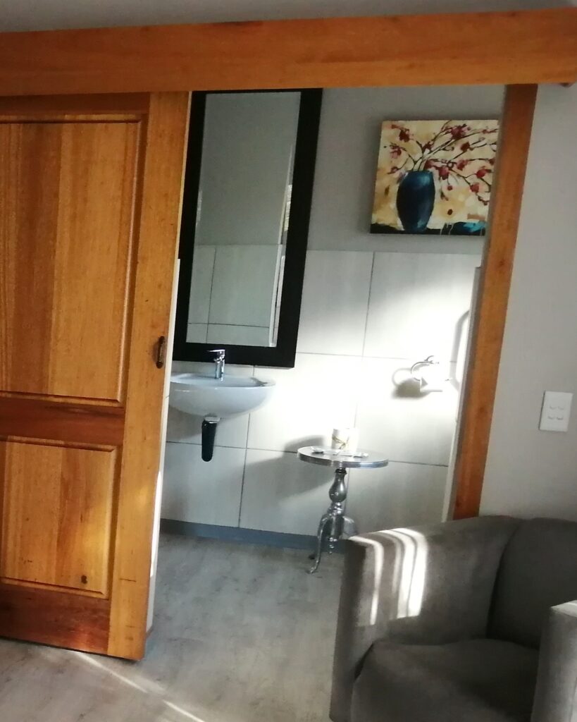 - Adequate leg space at the basin with lever tap. Mirror and shelf within reach.