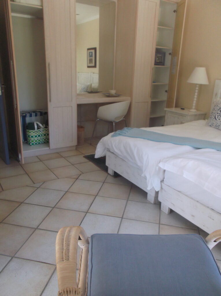 - Spacious bedroom with access to the cupboards. No lowered hang rail. Height of bed is 550 mm. Leg space of 760 mm at the dressing table. Two steps to access the private patio.