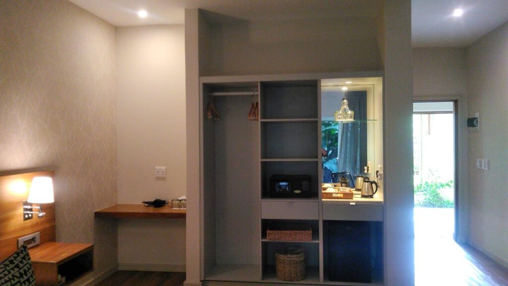 • Spacious open plan bedroom with access to the cupboards. No lowered hang rail. Height of the bed is 470 mm and leg space at the desk is 710 mm. Lamp switch not within reach.